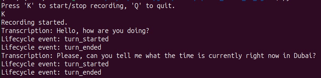 Press 'K' to start/stop recording, 'Q' to quit.When you press 'K', the agent will begin recording. As you speak, your voice will be transcribed using OpenAI's Speech-to-Text model. When the lifecycle event detects that you've finished speaking, the agent will generate a response and play it back as synthesized speech.