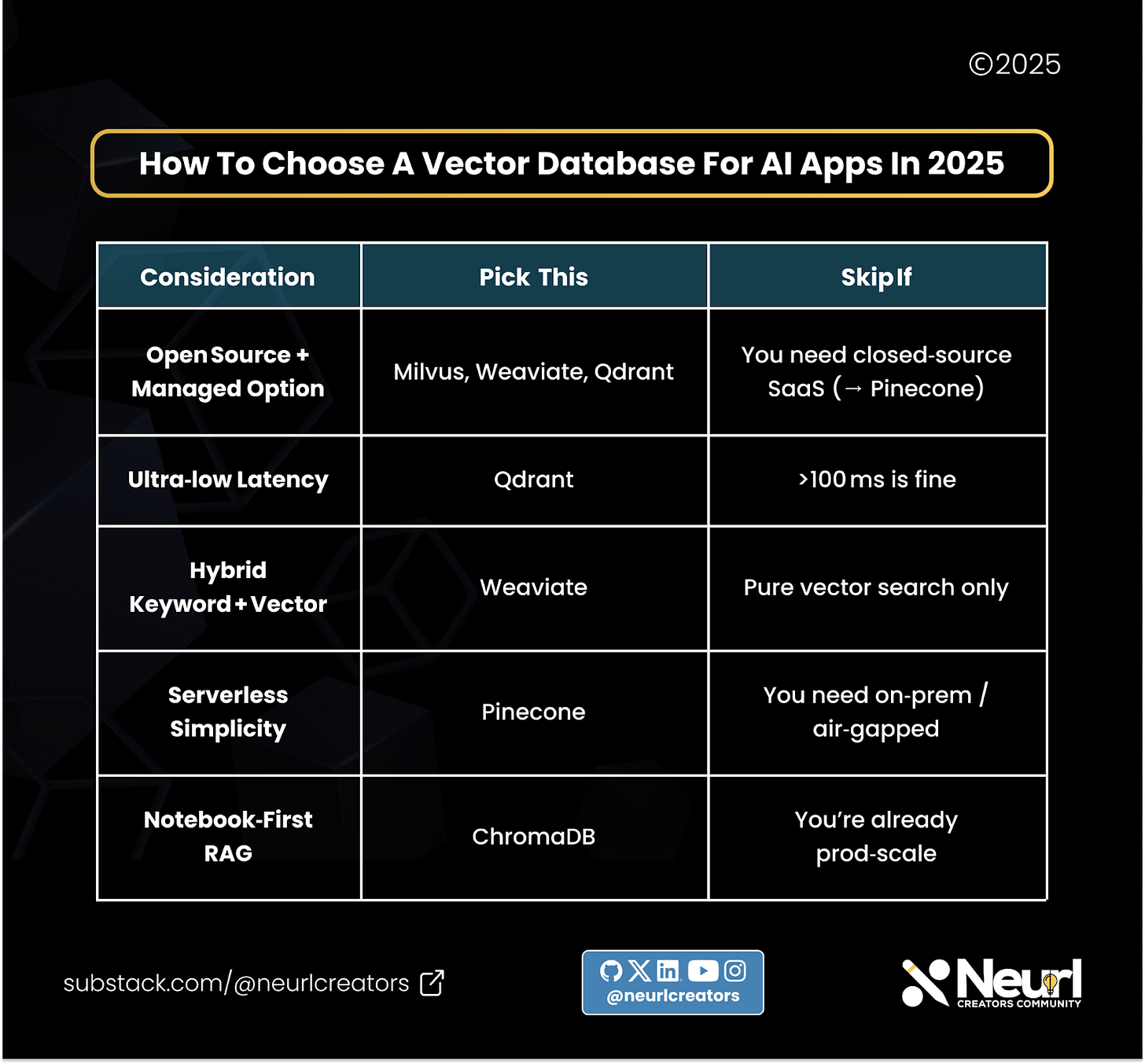 Start building today! Want the full step-by-step tutorial? We published a more in-depth guide on the âTop 6 AI Vector Databases Compared (2025): Which One Should You Choose as an AI Builder?â in The Neural Blueprint.